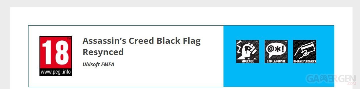 Quand il ne s'agit pas de l'ESRB, c'est le PEGI qui s'y met. Comme l'a découvert Corkben, l'organisme de classification européen a évalué un certain Assassin's Creed Black Flag Resynced, sans en préciser les plateformes. Vous l'aurez compris, il s'agit du titre de ce remake, qui sied parfaitement à la licence et à la méta-histoire. En effet, contrairement aux remasters ayant pu sortir et proposant juste un lifting graphique, ce projet devrait s'inscrire dans la narration de l'Animus Hub, ce qui signifierait alors que les mémoires de notre pirate de protagoniste seraient resynchronisées par nous (ou quiconque est l'actuel protagoniste), contrastant avec le contexte dans les locaux d'Abstergo Entertainment en 2013.