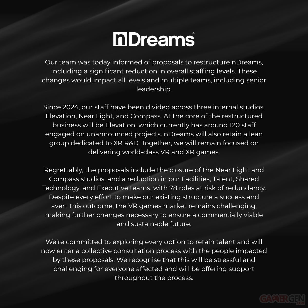 Le studio britannique nDreams vient d’annoncer une restructuration importante de son organisation interne. Dans un communiqué publié sur ses réseaux, l’entreprise explique étudier une réduction significative de ses effectifs ainsi que la fermeture de deux de ses studios internes. Au total, 78 postes sont actuellement menacés dans le cadre de cette réorganisation.