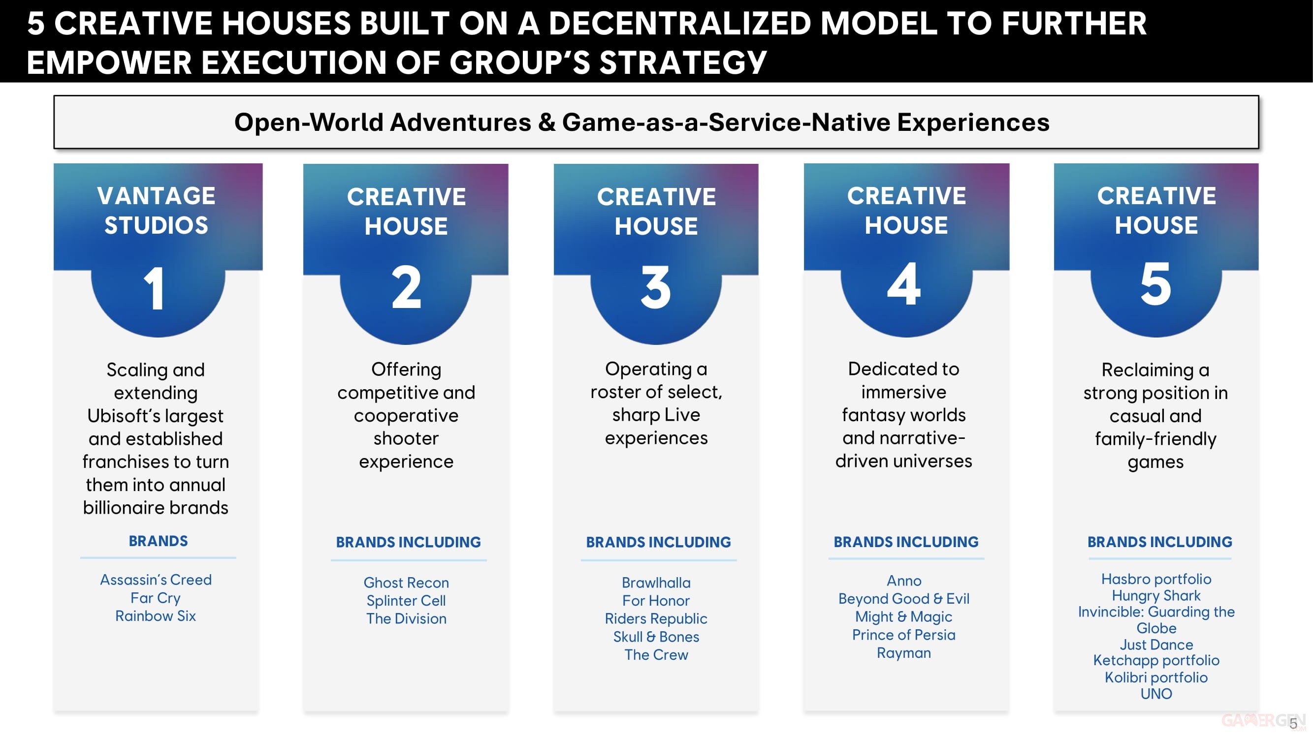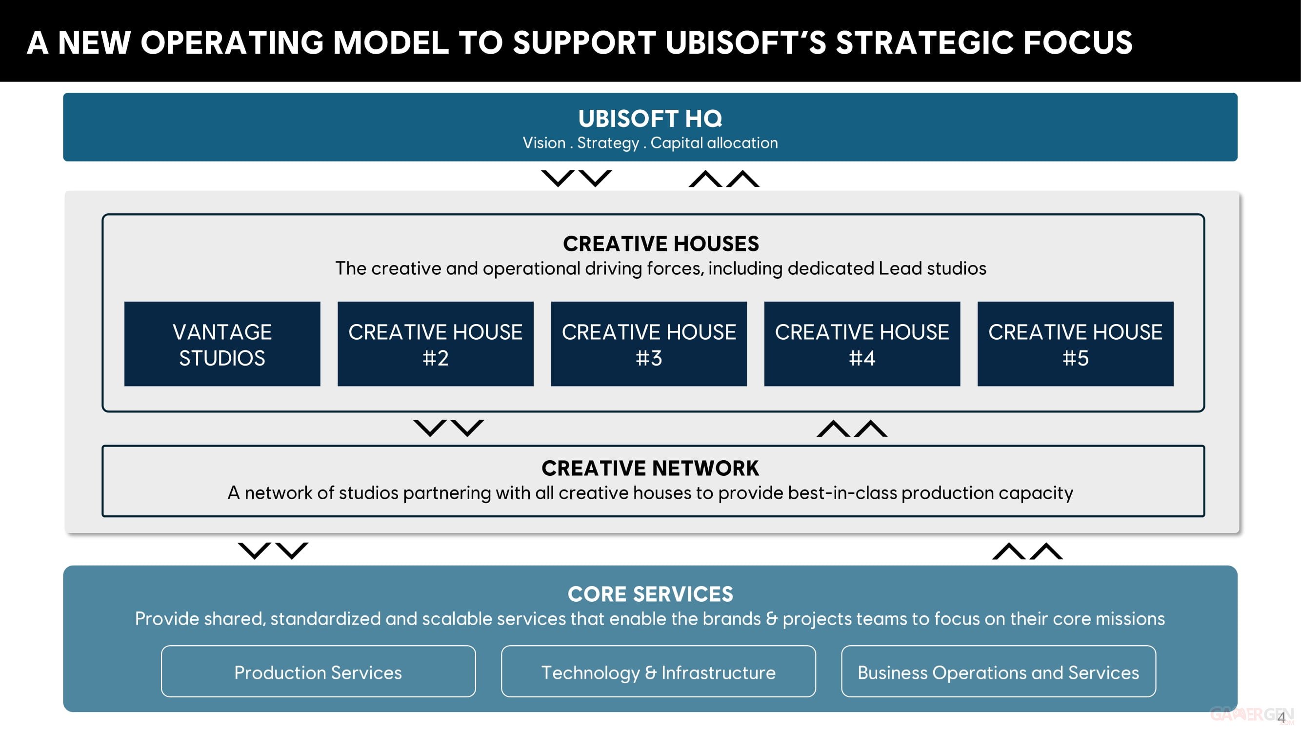 Ce mercredi soir, Ubisoft a enfin partagé les détails de sa restructuration interne, qui passe malheureusement par l'annulation du remake de Prince of Persia : Les Sables du Temps, entre autres. Comme prévu, le nouveau modèle opérationnel décentralisé va être structuré autour de Creative Houses, au nombre de cinq. Oui, même dans le communiqué français, seuls des termes anglais sont utilisés... Bon, en dehors de Vantage Studios, elles n'ont pas de noms leur étant associés, ce qui est peu créatif pour le coup, juste un numéro à la manière de l'organisation interne de Square Enix, mais en bien plus éparpillé puisque ce sont ici les marques, soit les jeux, qui sont regroupées et non pas les nombreux studios disséminés de par le monde. D'ailleurs, les studios ou équipes qui n'y seront pas rattachés formeront le Creative Network, servant à les soutenir et aider par des Core Services.