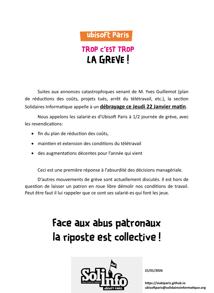 Face à cette situation, les syndicats Solidaires Informatique et STJV ont rapidement appelé à la grève dès ce jeudi matin en France, un débrayage pour être précis.